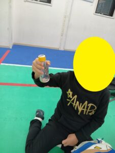 ペッットボトルを上に投げ真っすぐ立つかで競う