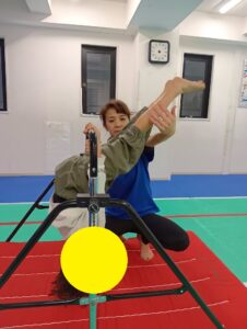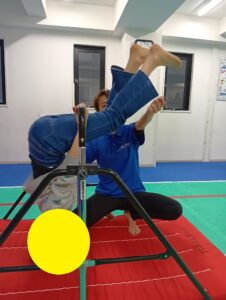 その後、鉄棒から両脚を離して身体が「くの字」になるところで止まります。
